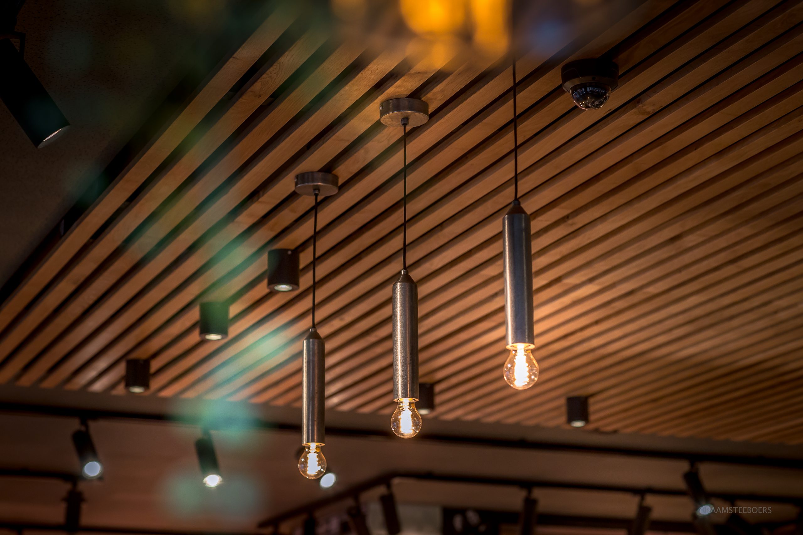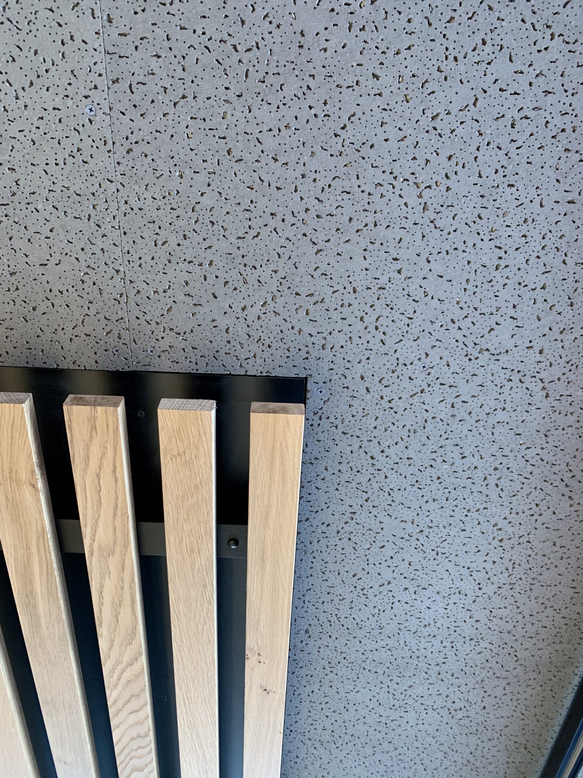 Met behulp van OWA RAW creëerden we een beton-ogend akoestisch basisplafond waaronder de verlichting en ventilatiesystemen zijn gemonteerd. De plafondpanelen zijn bovendien speciaal op maat gezaagd. Van origine is de afmeting van een OWA RAW paneel 1200 x 2400 mm, maar voor deze bakkerij werden panelen met een afmeting van 1200 x 600 mm geleverd. De custom made panelen zijn gemonteerd met schroeven in bijpassende kleur voor een harmonieus geheel.